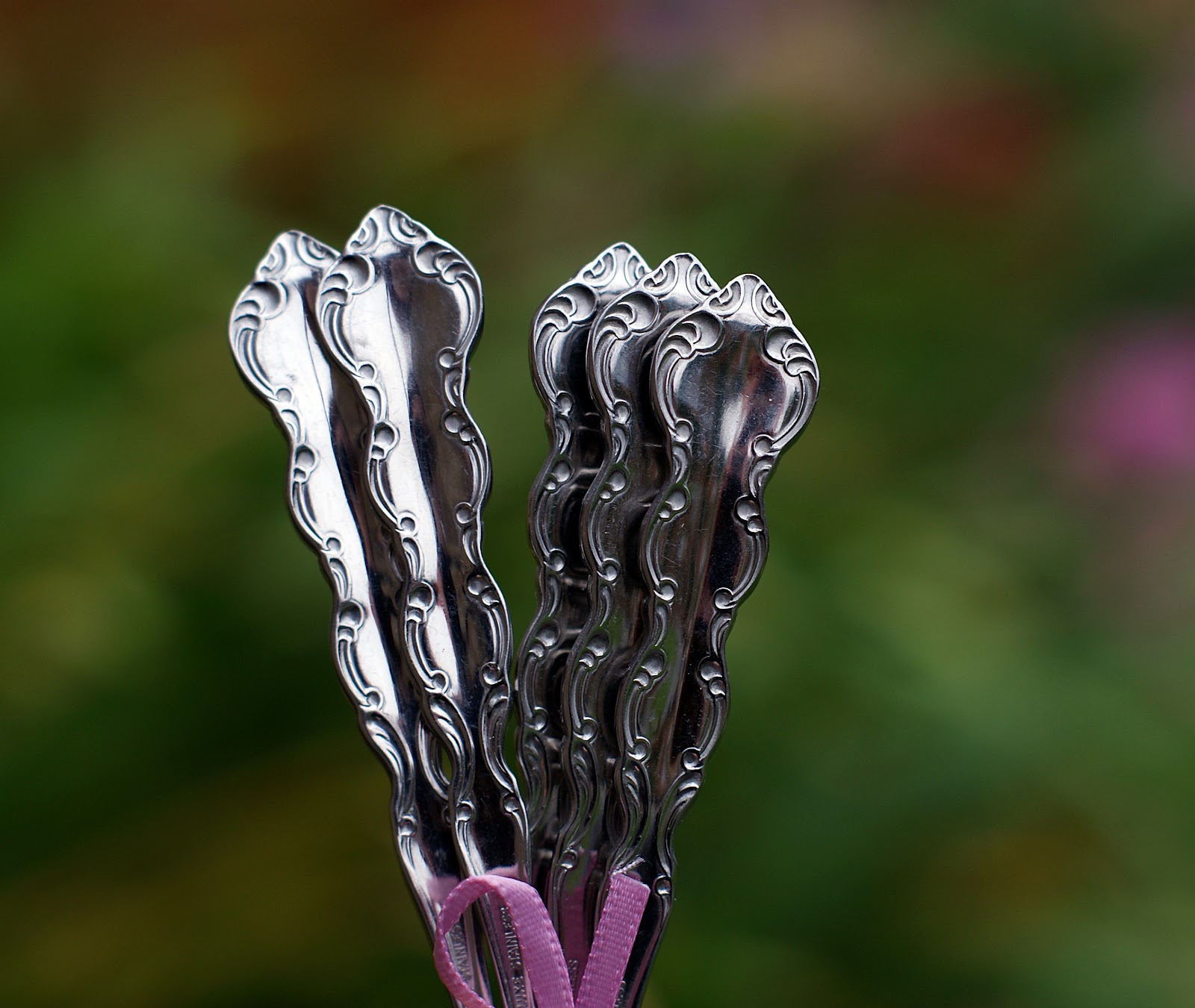 A lovely relative, who likes tea and cakes, had a birthday coming up so I paid the shop a visit to see if they had anything that would make a present for her. I actually had to make a short list but finally settled on a plate and some cake forks which looked like this!: